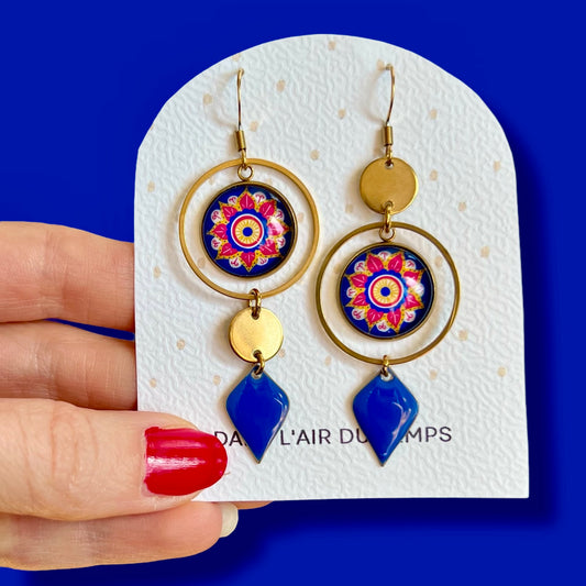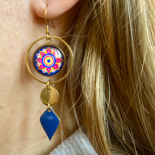 Boucles d'oreilles asymétriques mandala bleu rose jaune