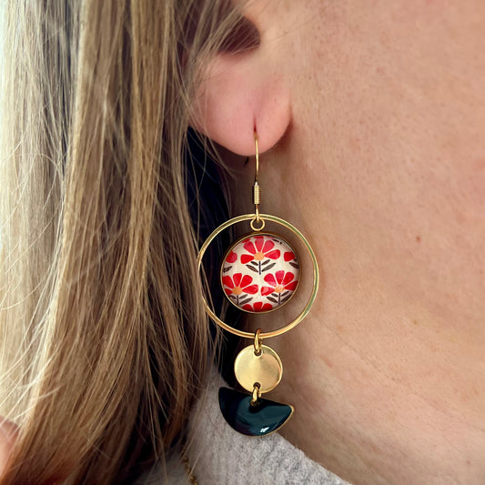 Boucles d'oreilles asymétriques motif rouge et blanc finition dorée ou argentée