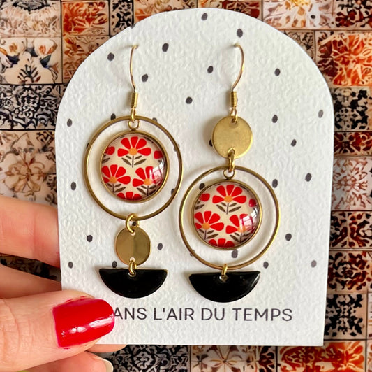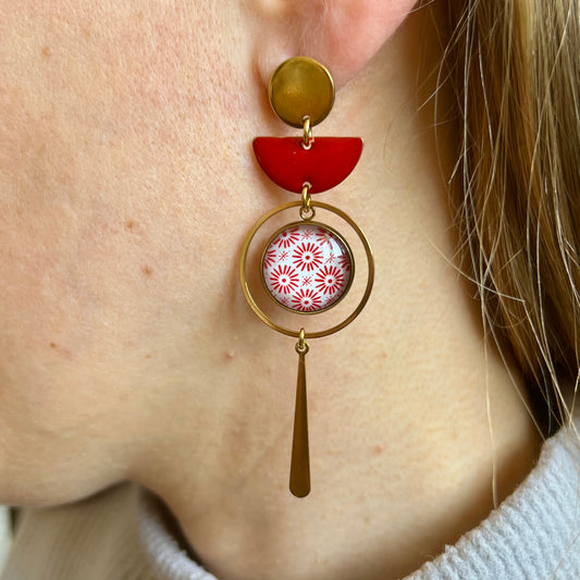 Boucles d'oreilles asymétriques motif rouge et blanc style japon finition dorée ou argentée