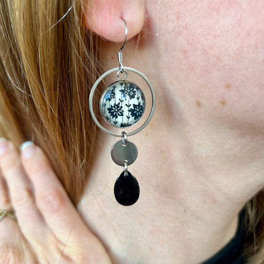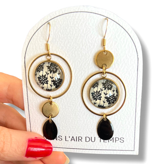 Boucles d'oreilles asymétriques fleurs noires et blanches finition dorée ou argentée