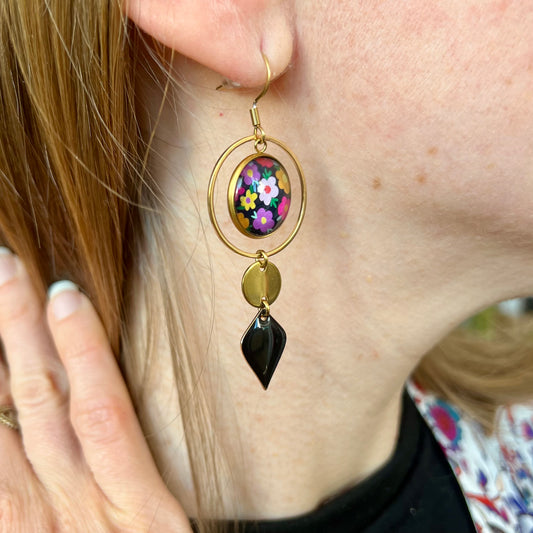 Boucles d'oreilles asymétriques fleurs multicolores sur fond noir finition dorée ou argentée