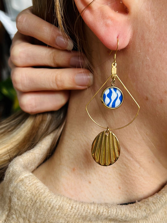 Blue geometric Dangle Earrings, black Enamel, golden or silver finish