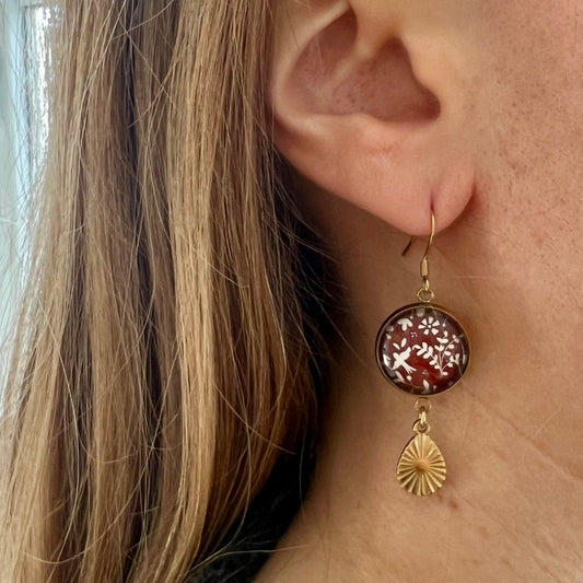 Burgundy mandala Dangle Earrings, Golden
