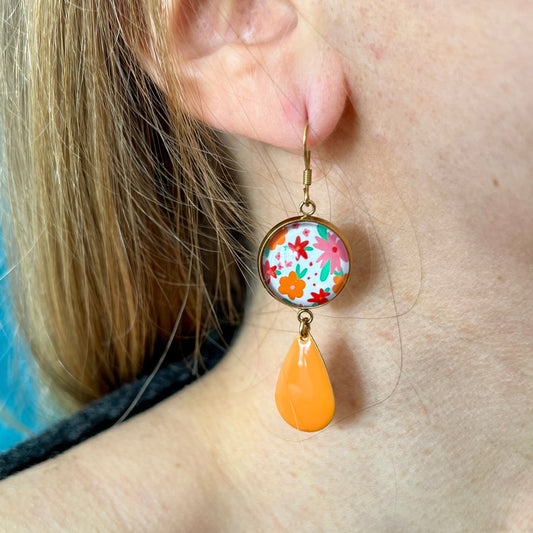 Pink and orange Flowers Earrings, Green Enamel, Golden or Silver Finish
