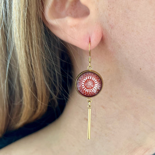 Burgundy mandala Dangle Earrings, Golden