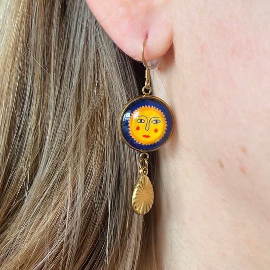 Little Sun Face and Moon HOOP EARRINGS, golden or silver finish