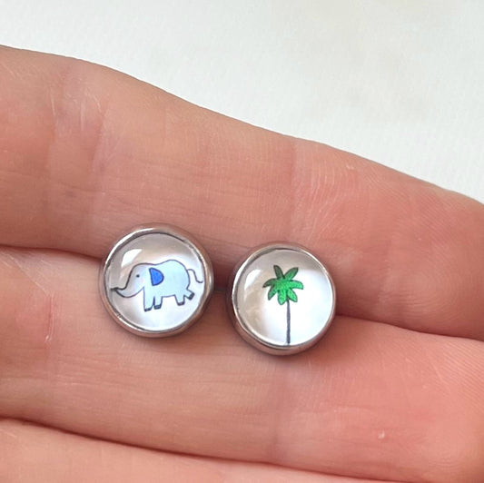 Elephant and Palm Kids Stud Earrings / " Wild and Free "