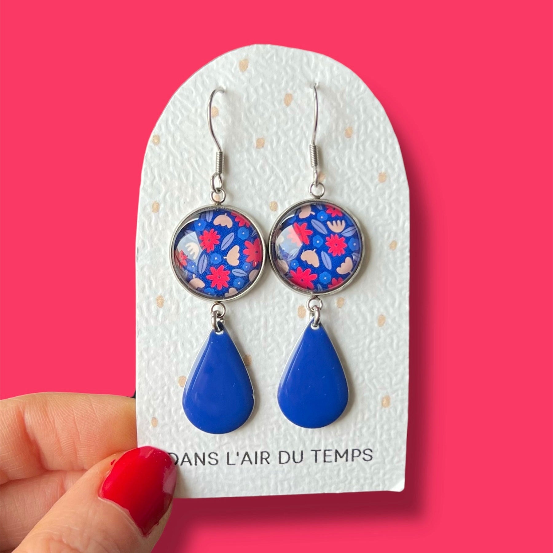 Boucles d'Oreilles fleurs rouges sur fond bleu, émail Bleu