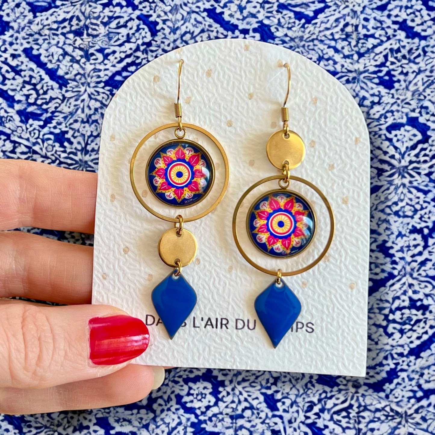 Boucles d'oreilles asymétriques mandala bleu rose jaune