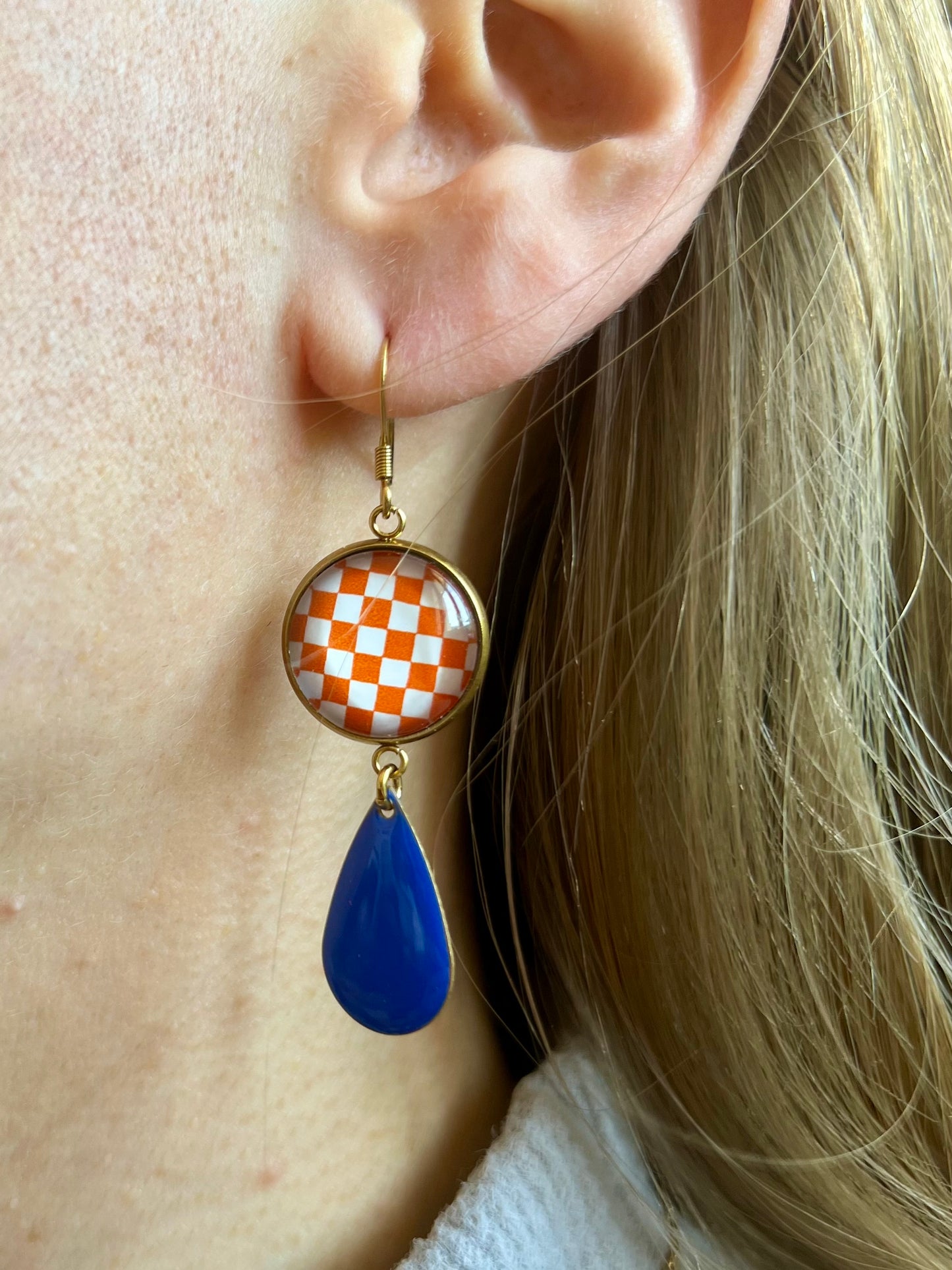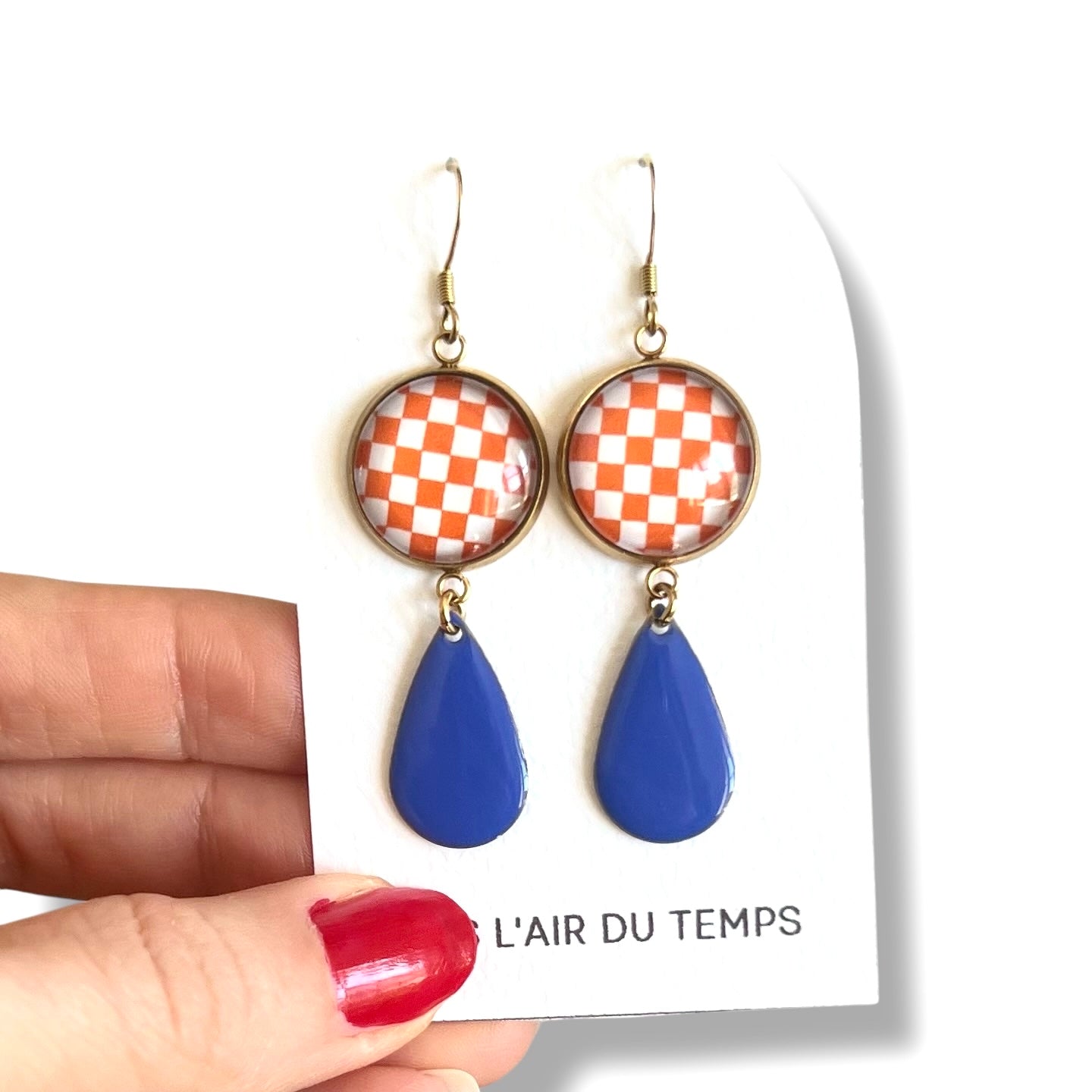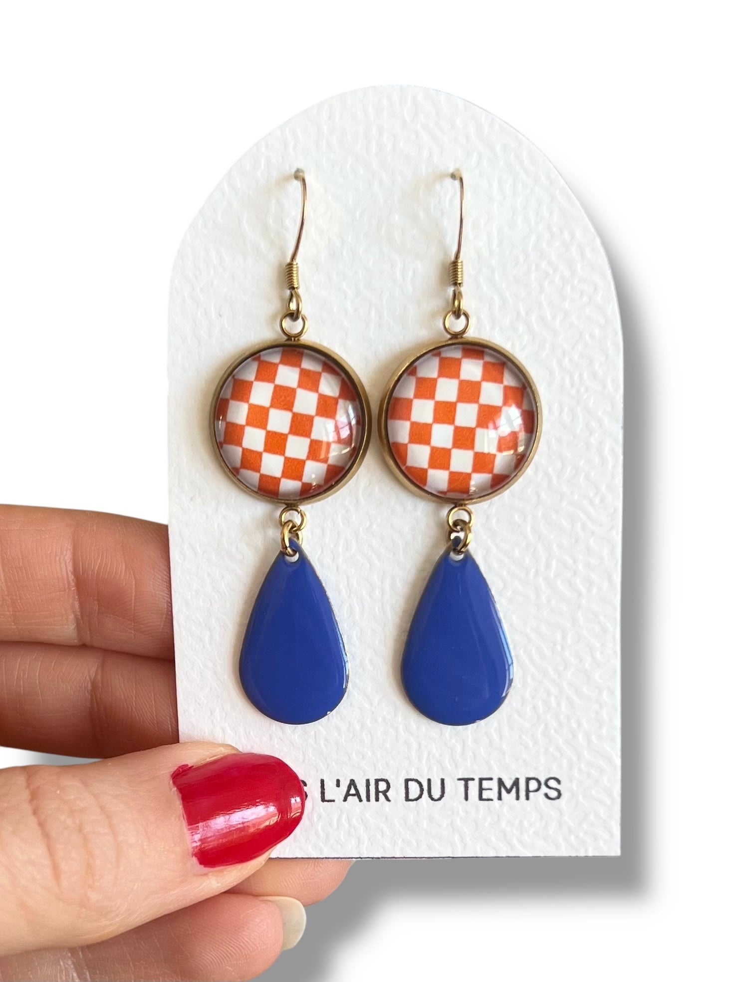 BOUCLES D'OREILLES pendantes motif damier orange et blanc, email bleu