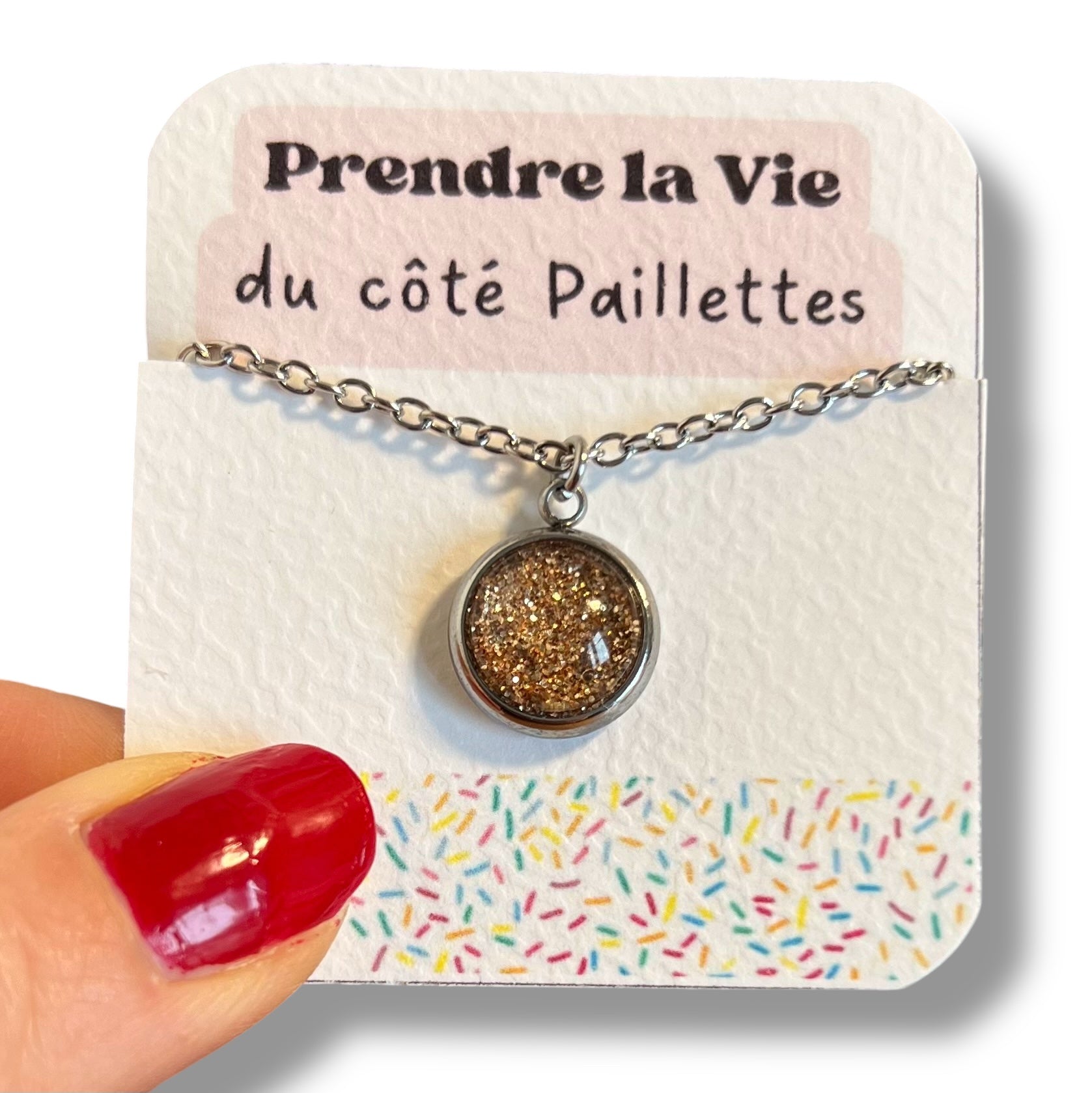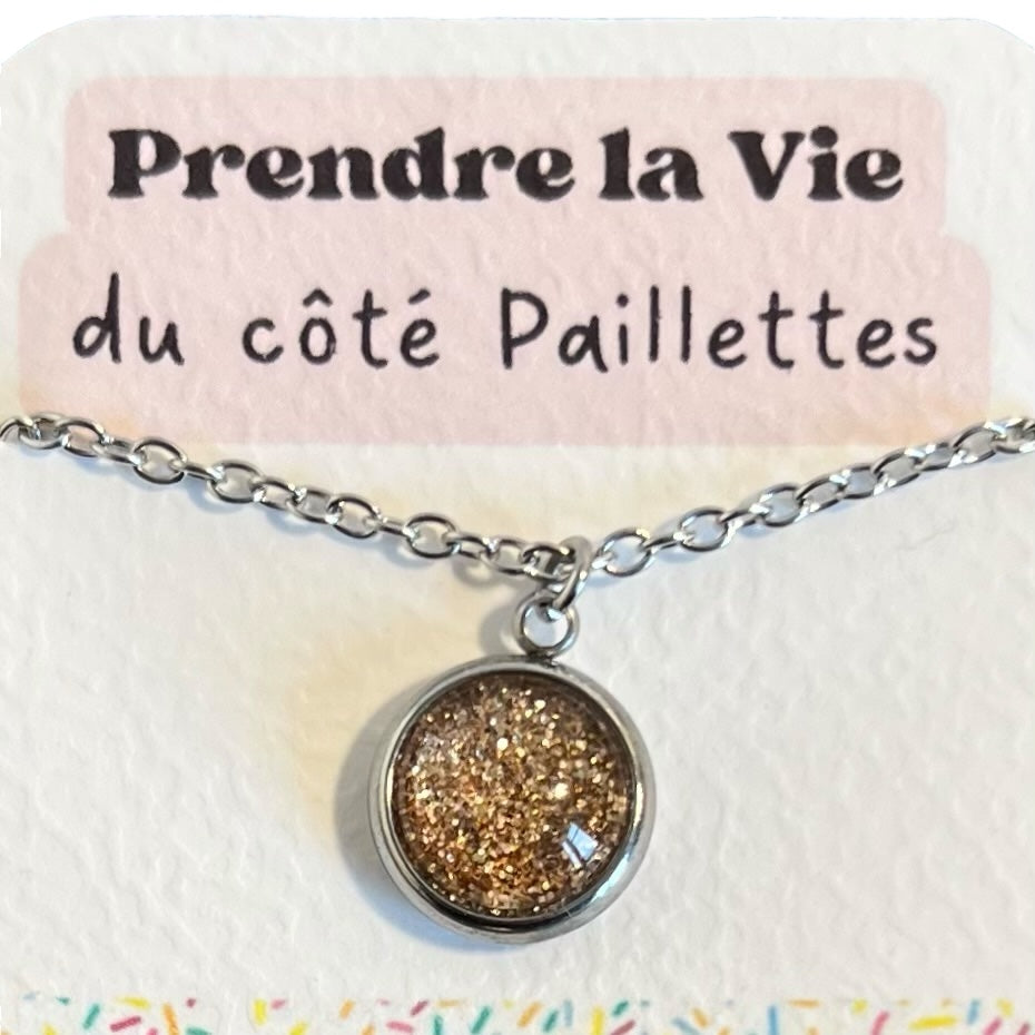 - Réalisé à partir de paillettes protégées par une couche de résine et un cabochon en verre