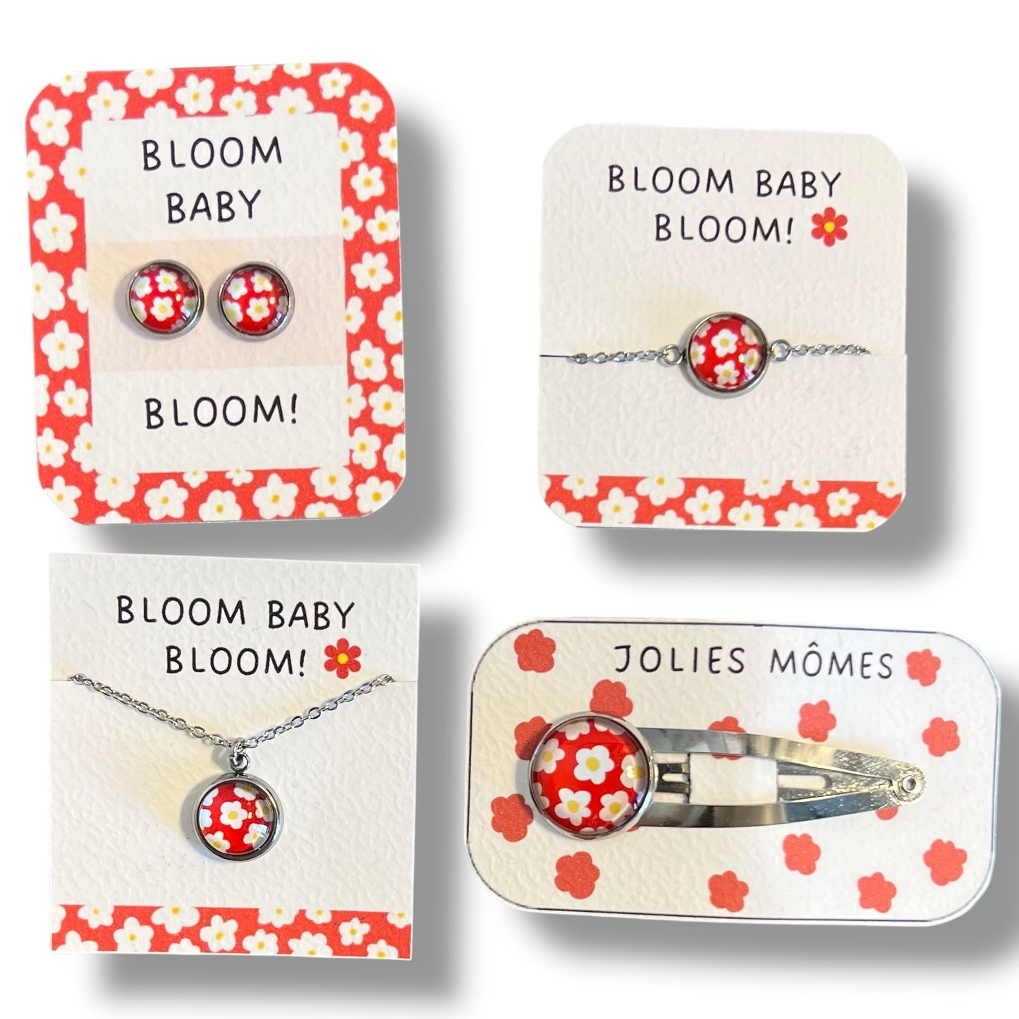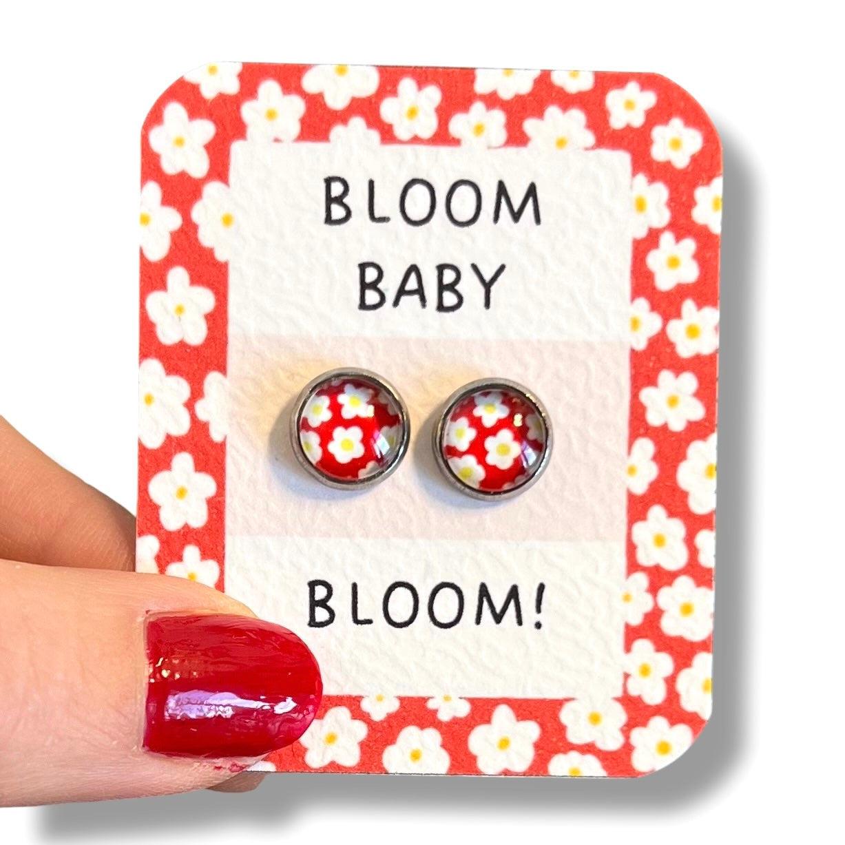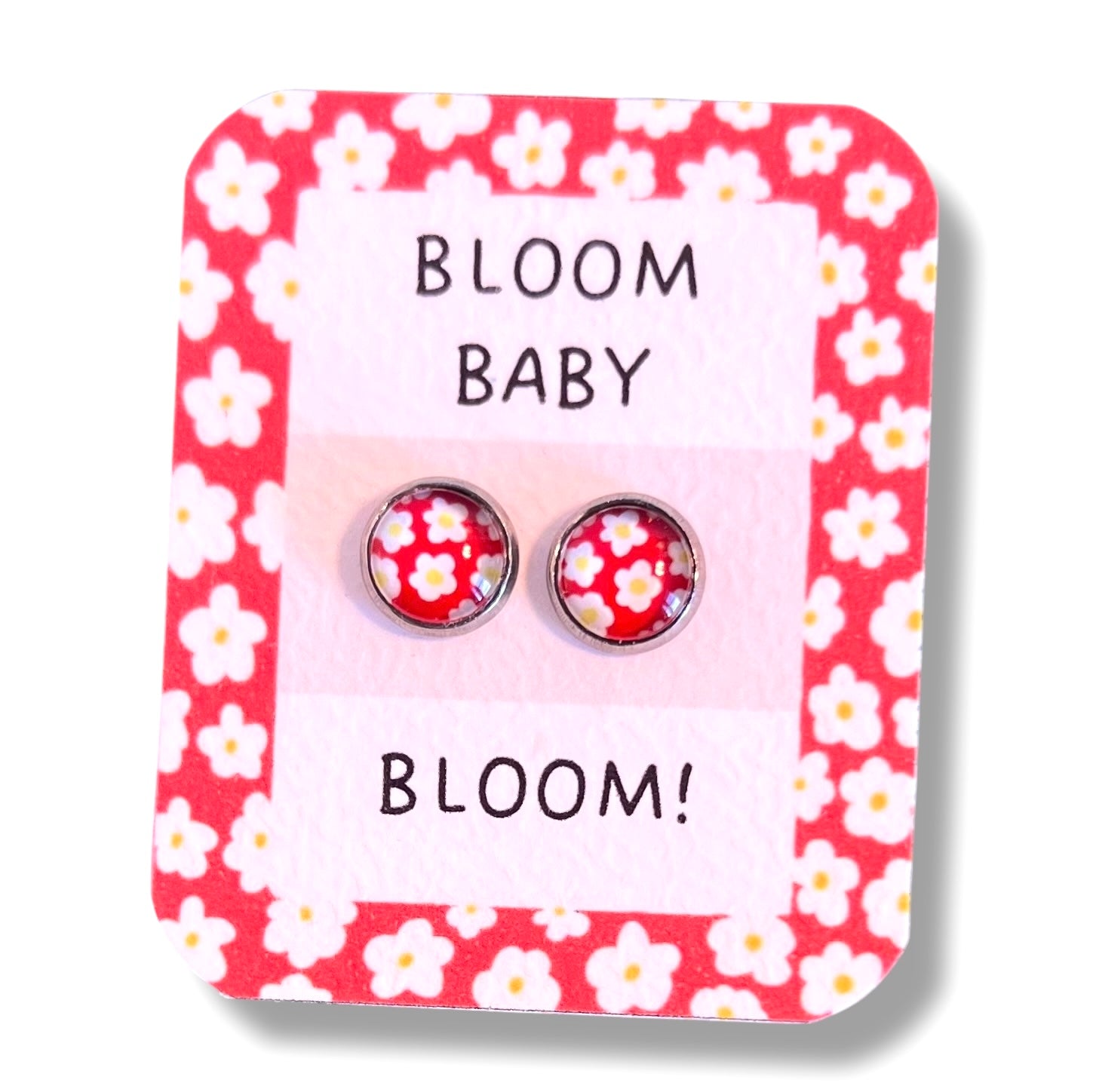 Puces d'Oreilles Enfant Fleurs Rétro blanches sur fond rouge/ "Bloom baby bloom! "