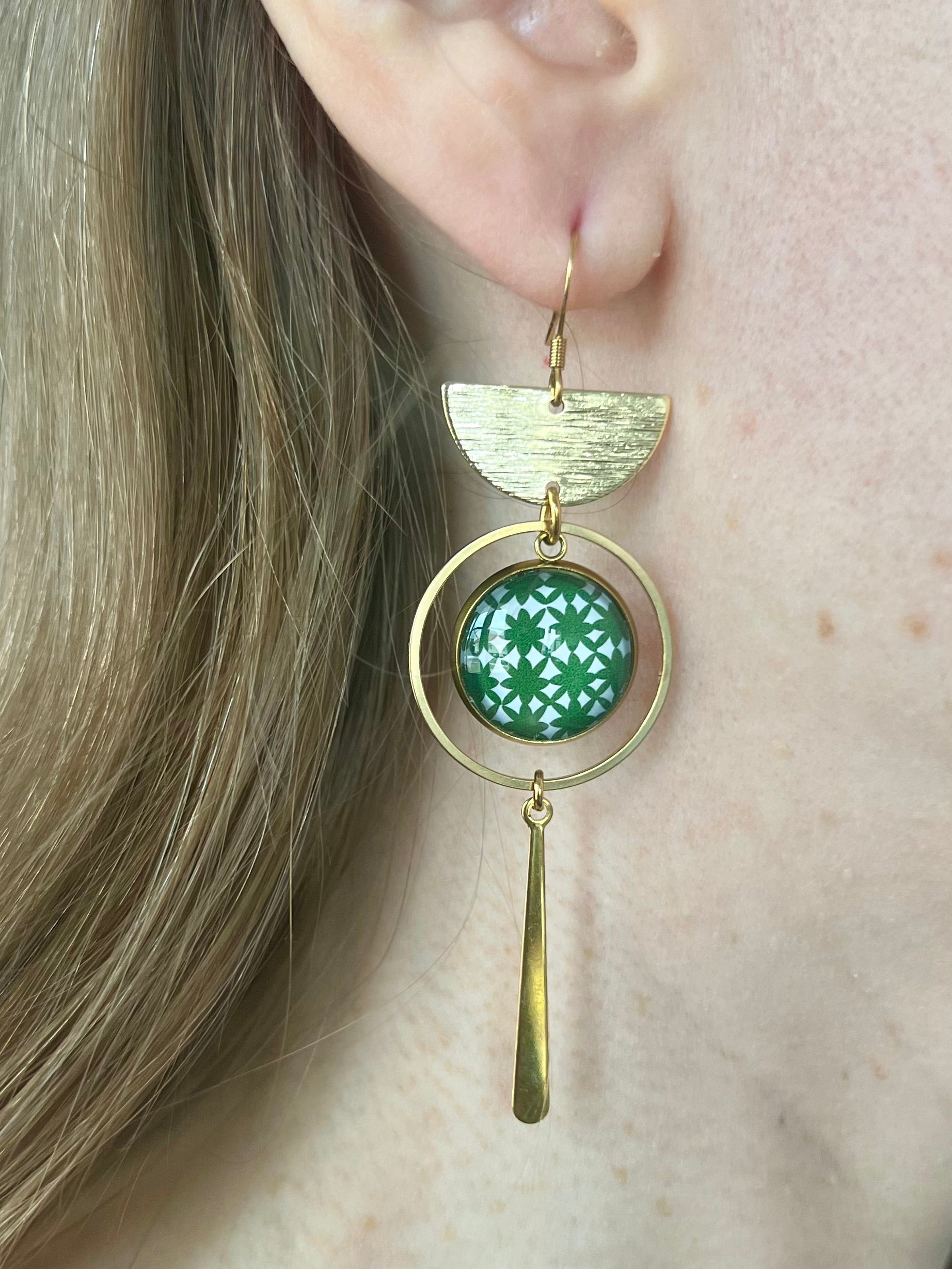 Boucles d'oreilles motif géométrique vert et blanc finition dorée ou argentée