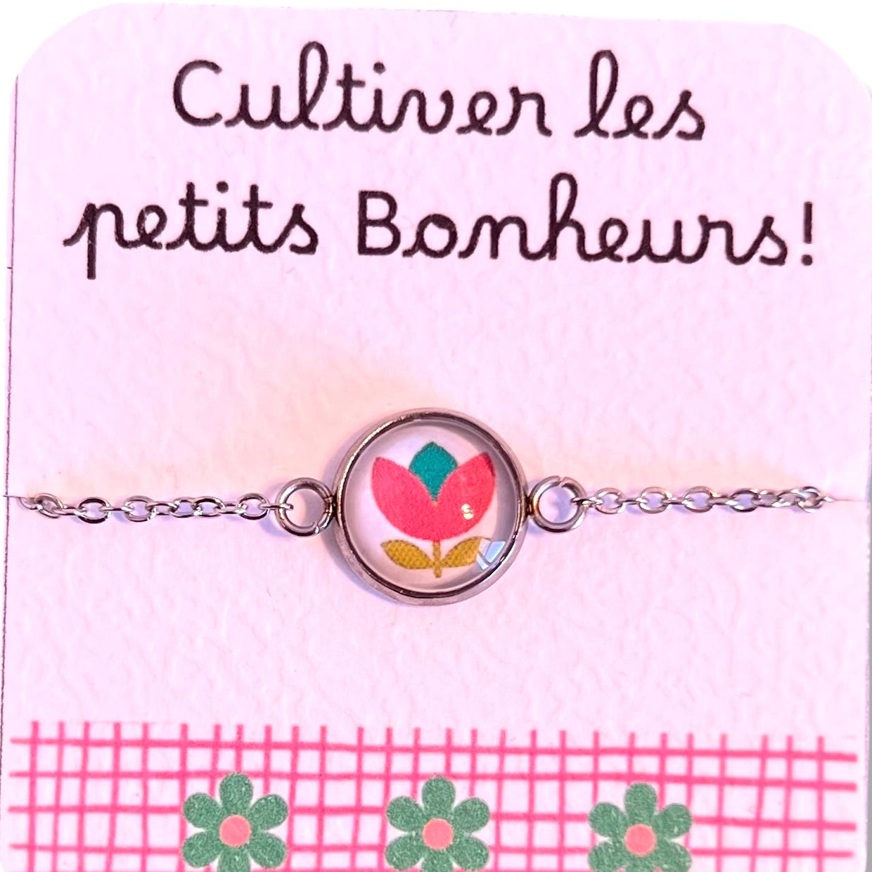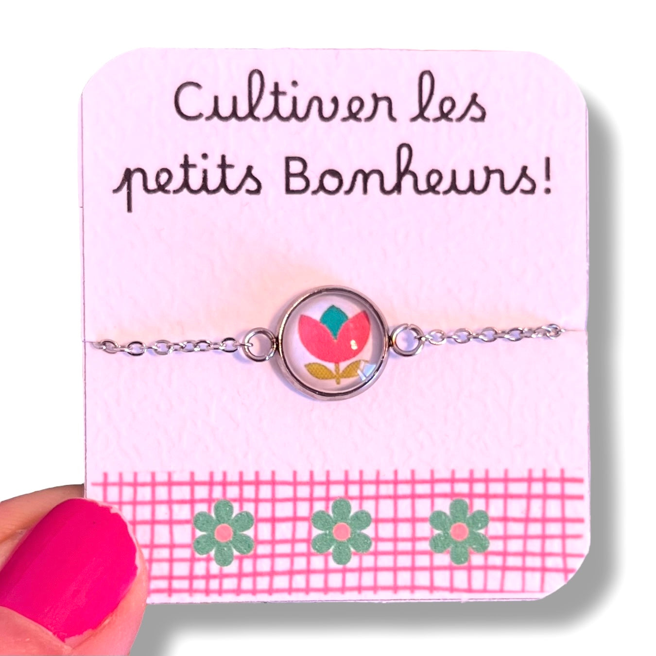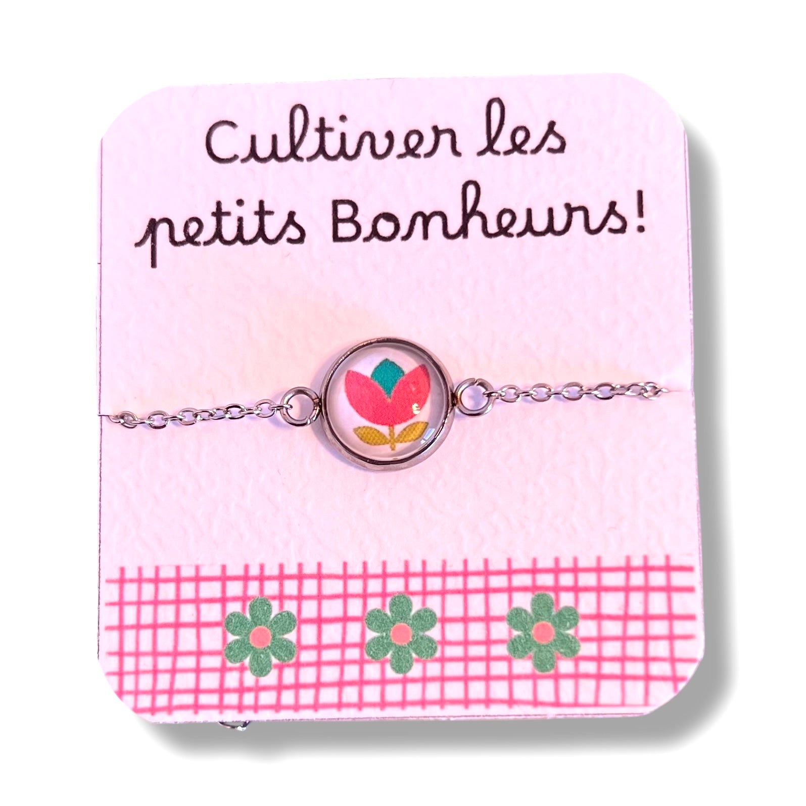 Bracelet Enfant Acier Inoxydable, fleur verte et rose / " Cultiver les petits bonheurs! "