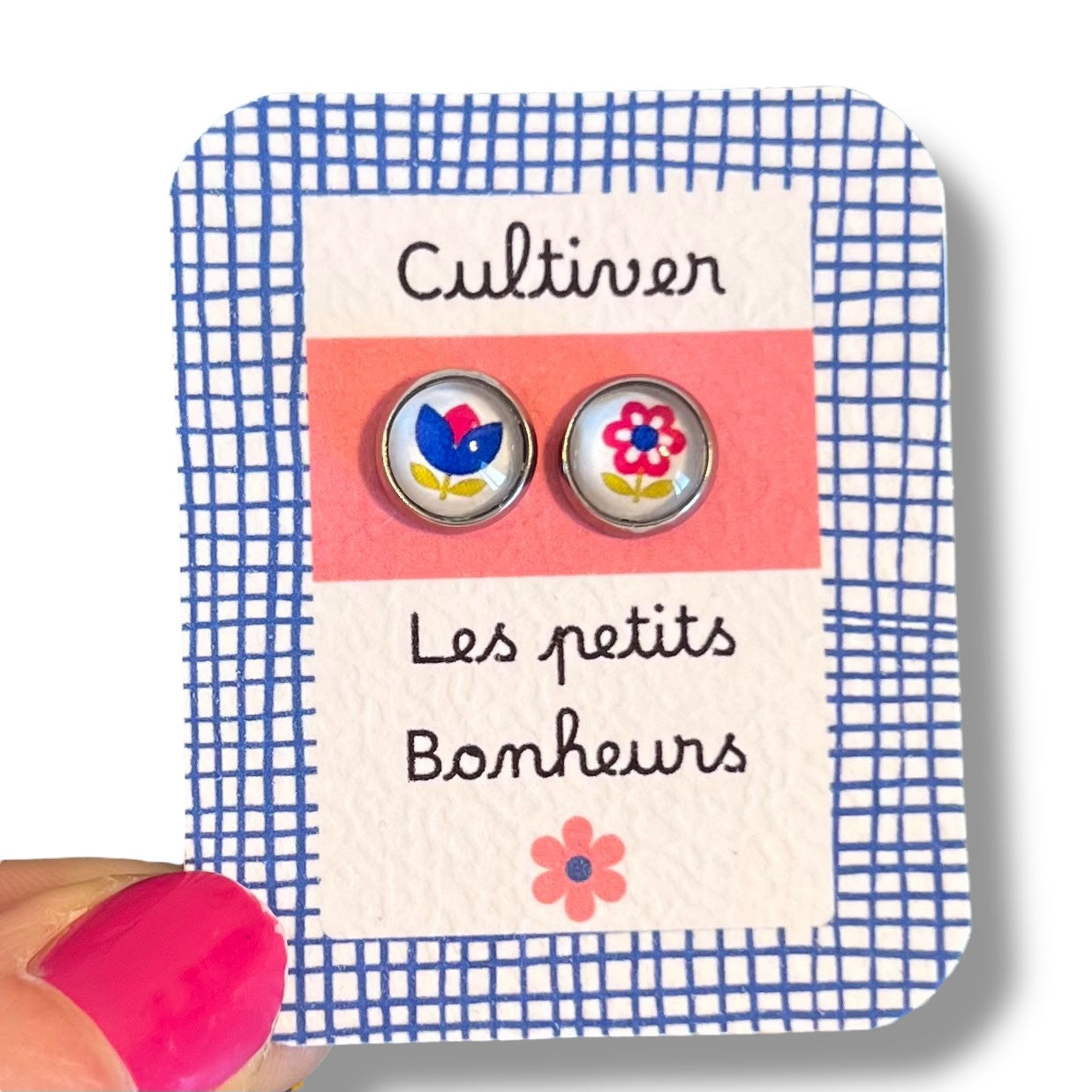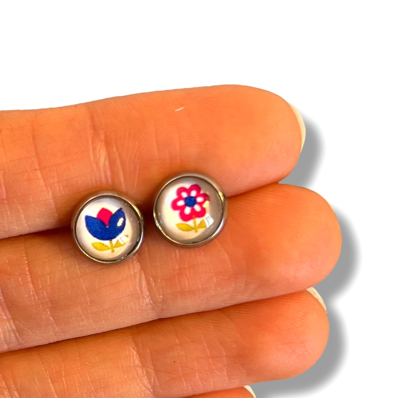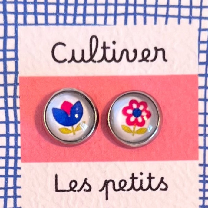 Puces d'Oreilles Enfant Fleurs Vintages Roses et Bleues