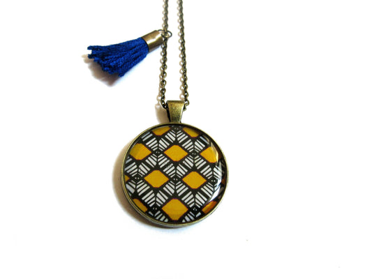 Collier Motif Ethnique Moutarde et pompon bleu