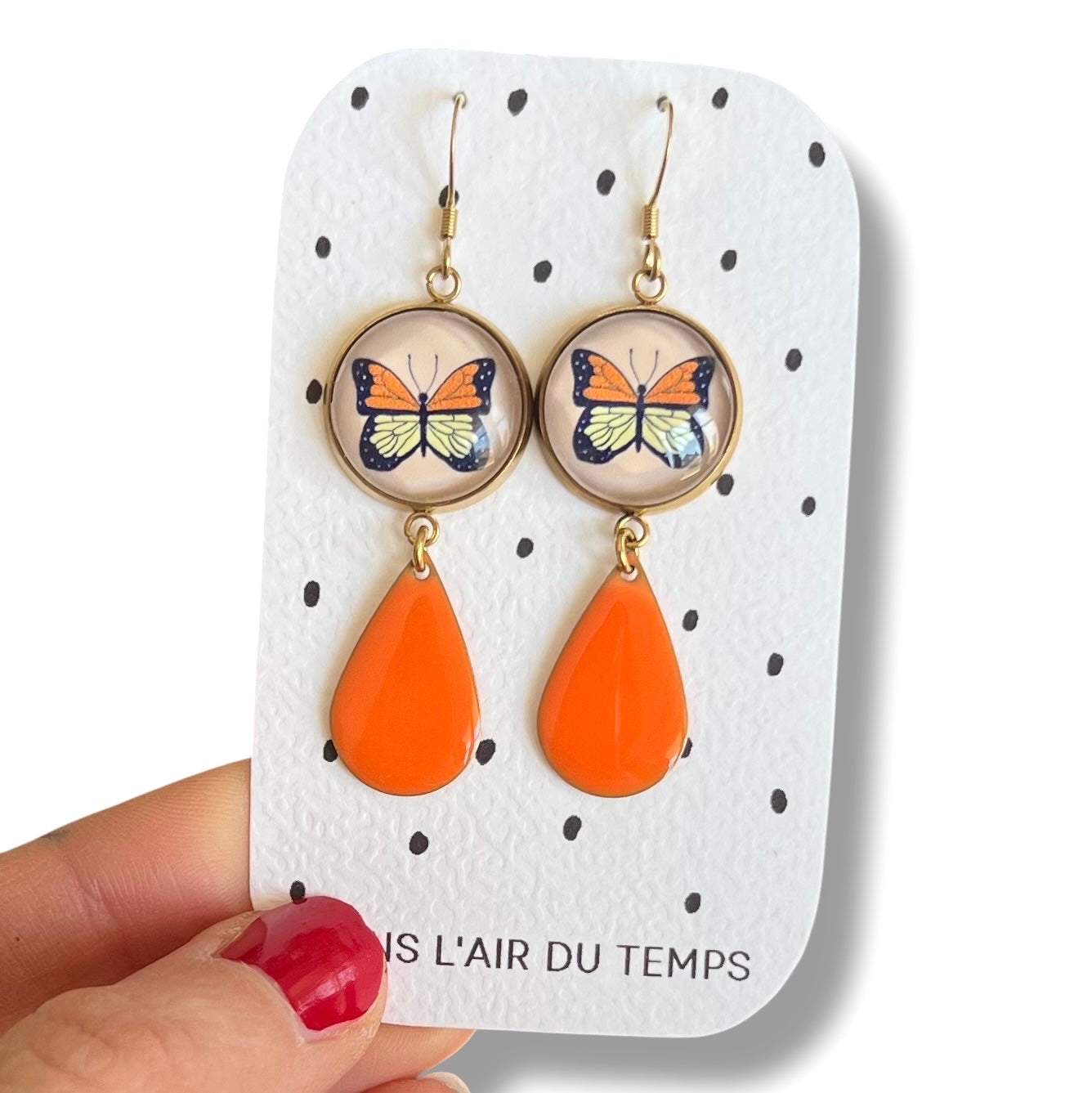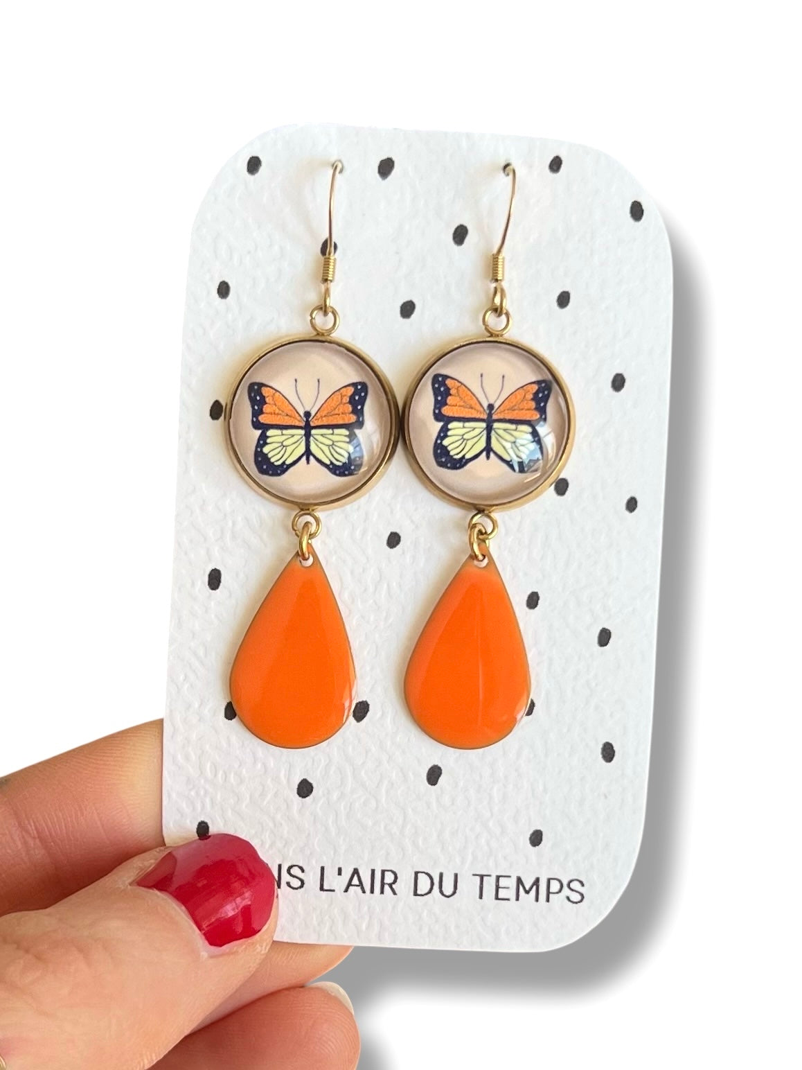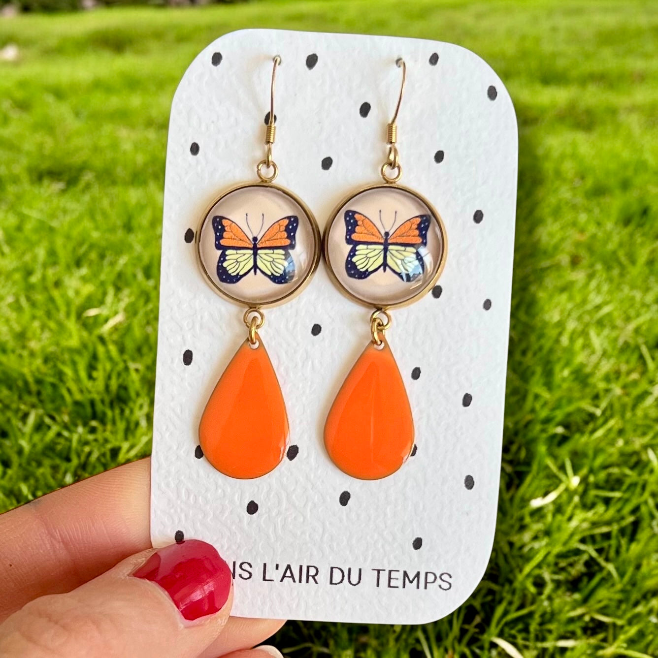 Boucles d'oreilles pendantes papillons oranges émail orange ♥