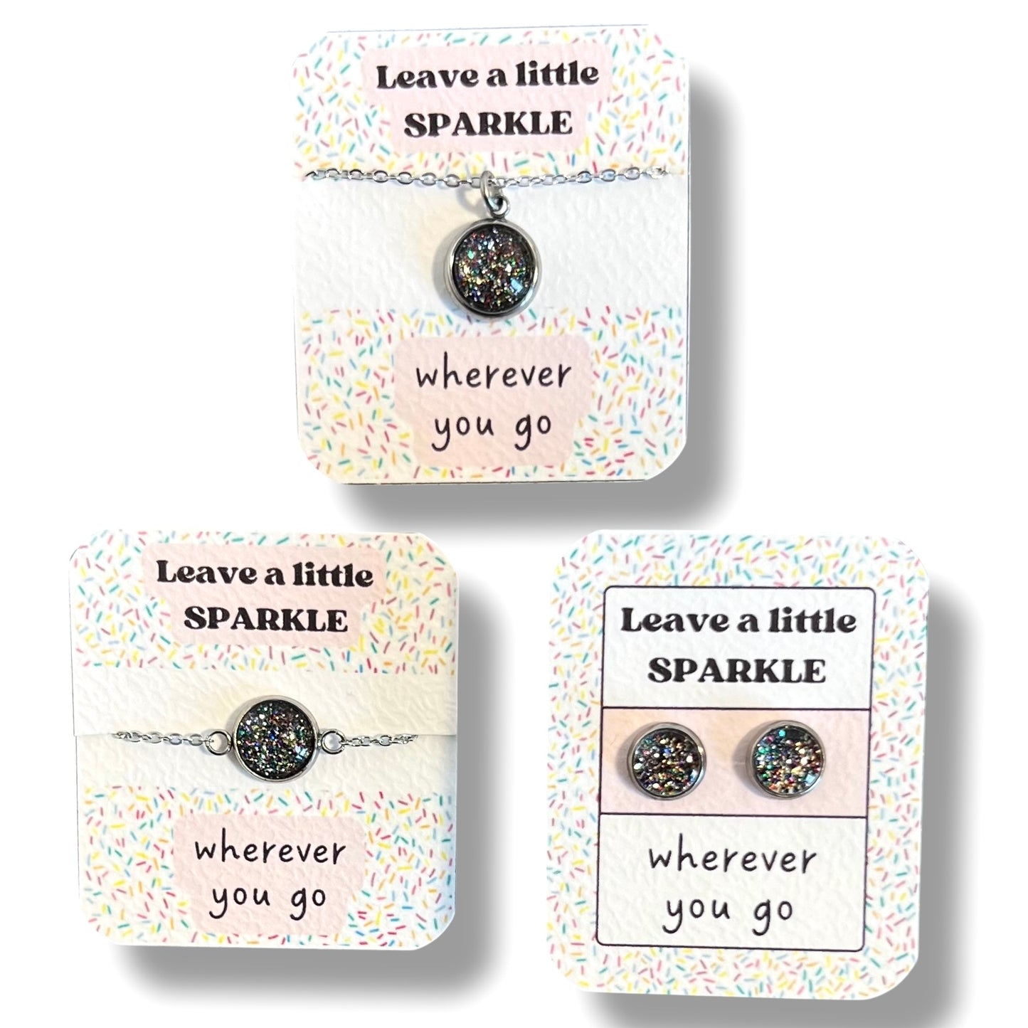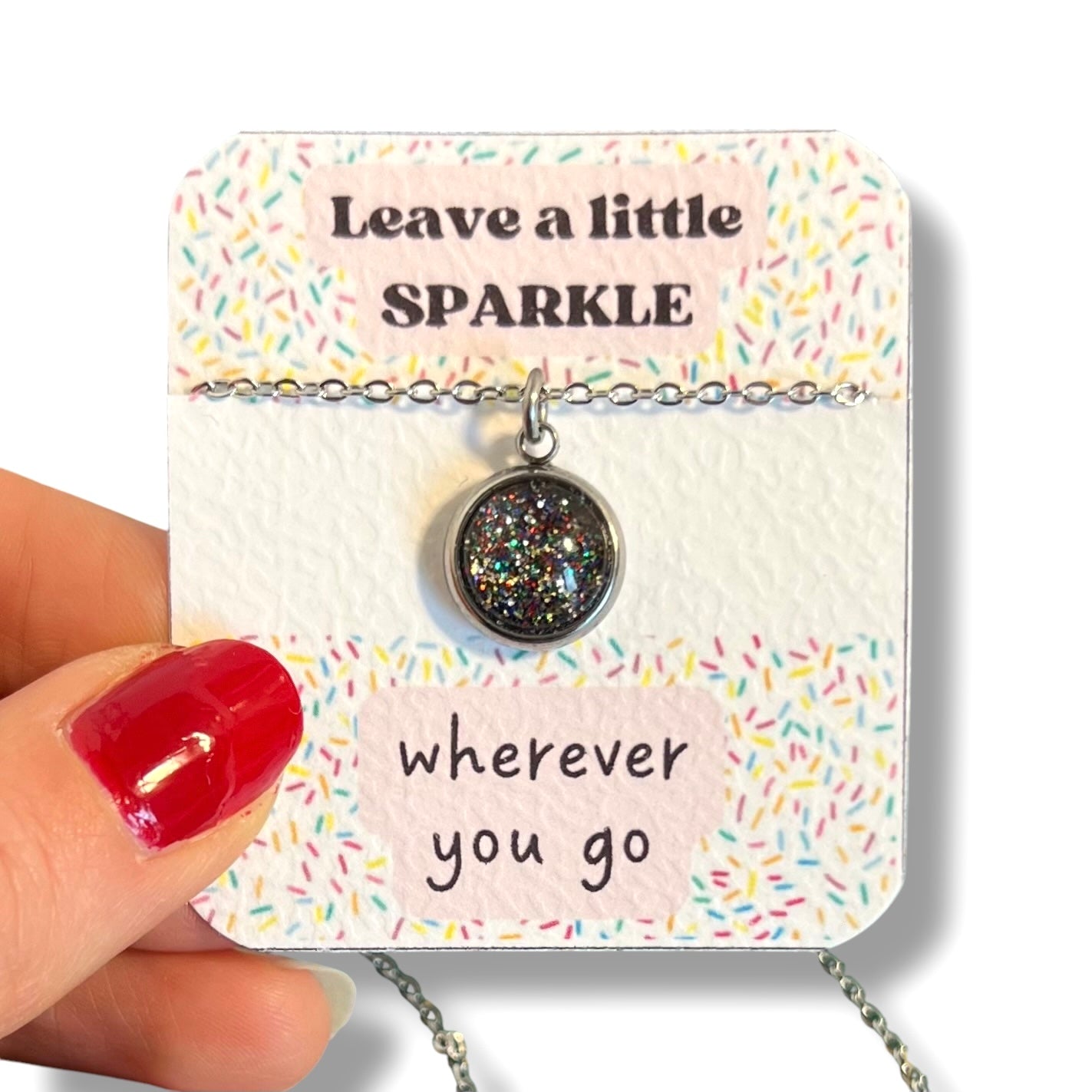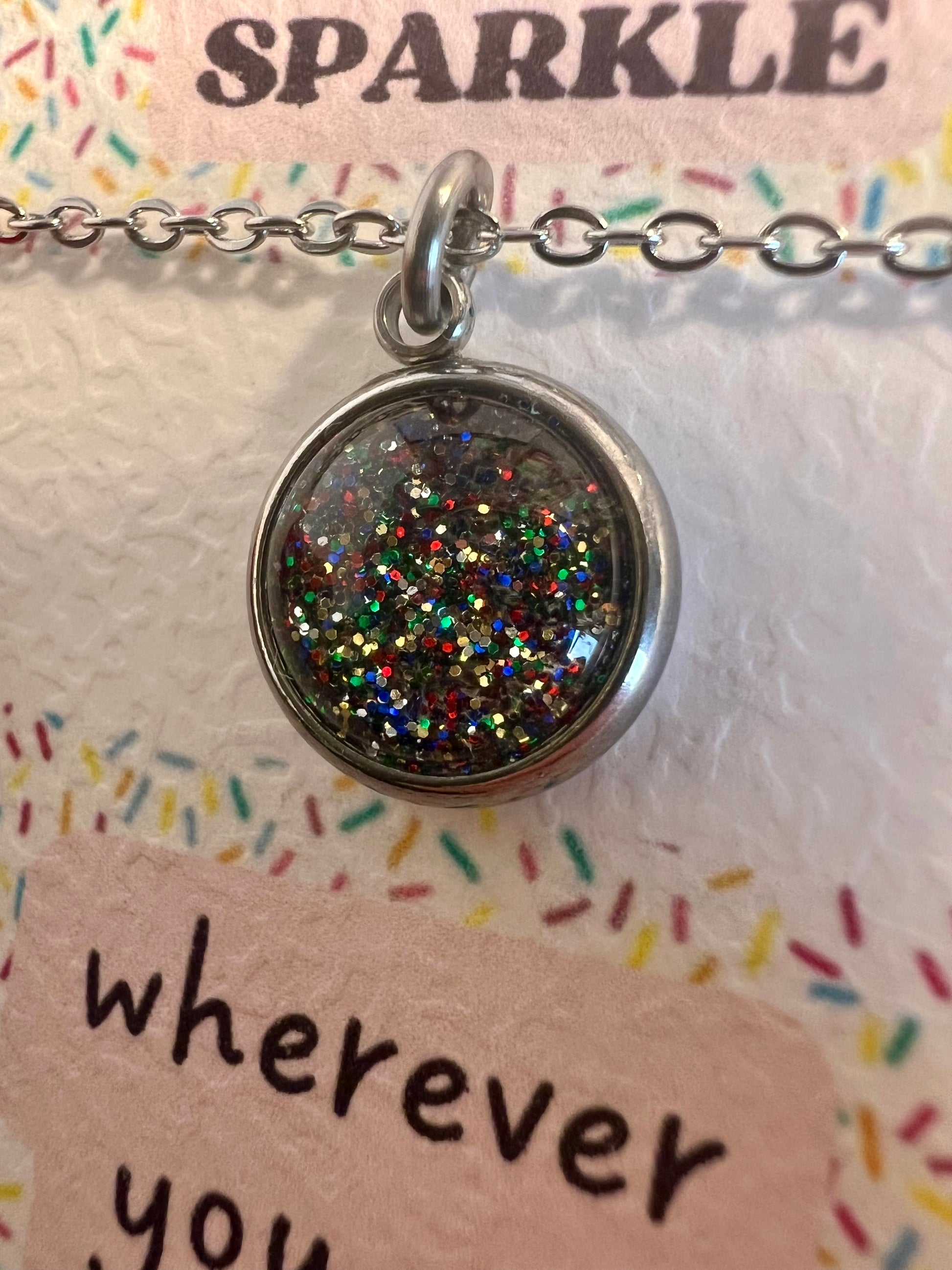 - Réalisé à partir de paillettes protégées par une couche de résine et un cabochon en verre
