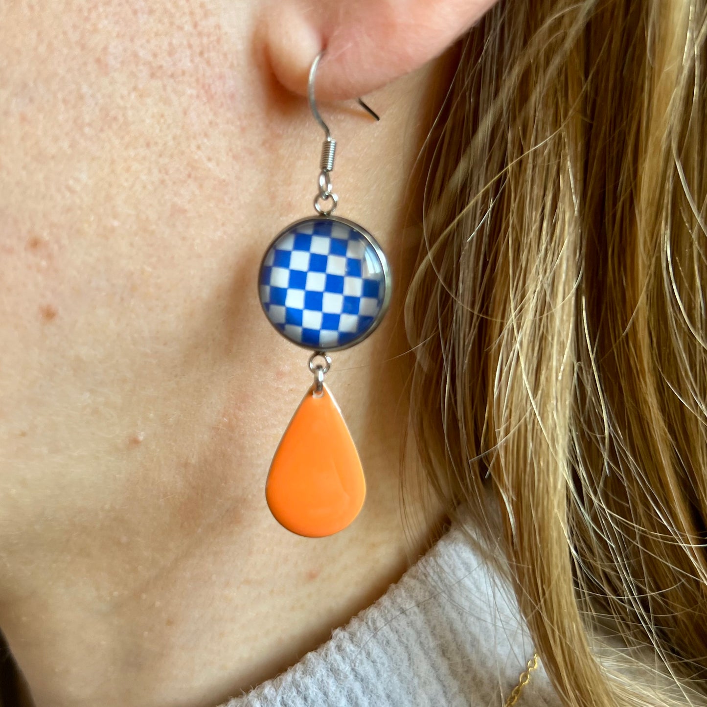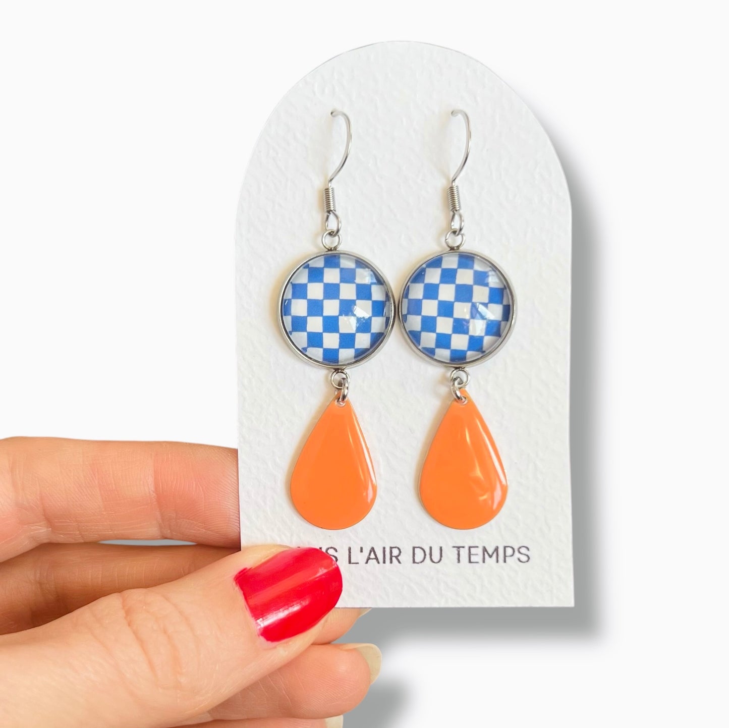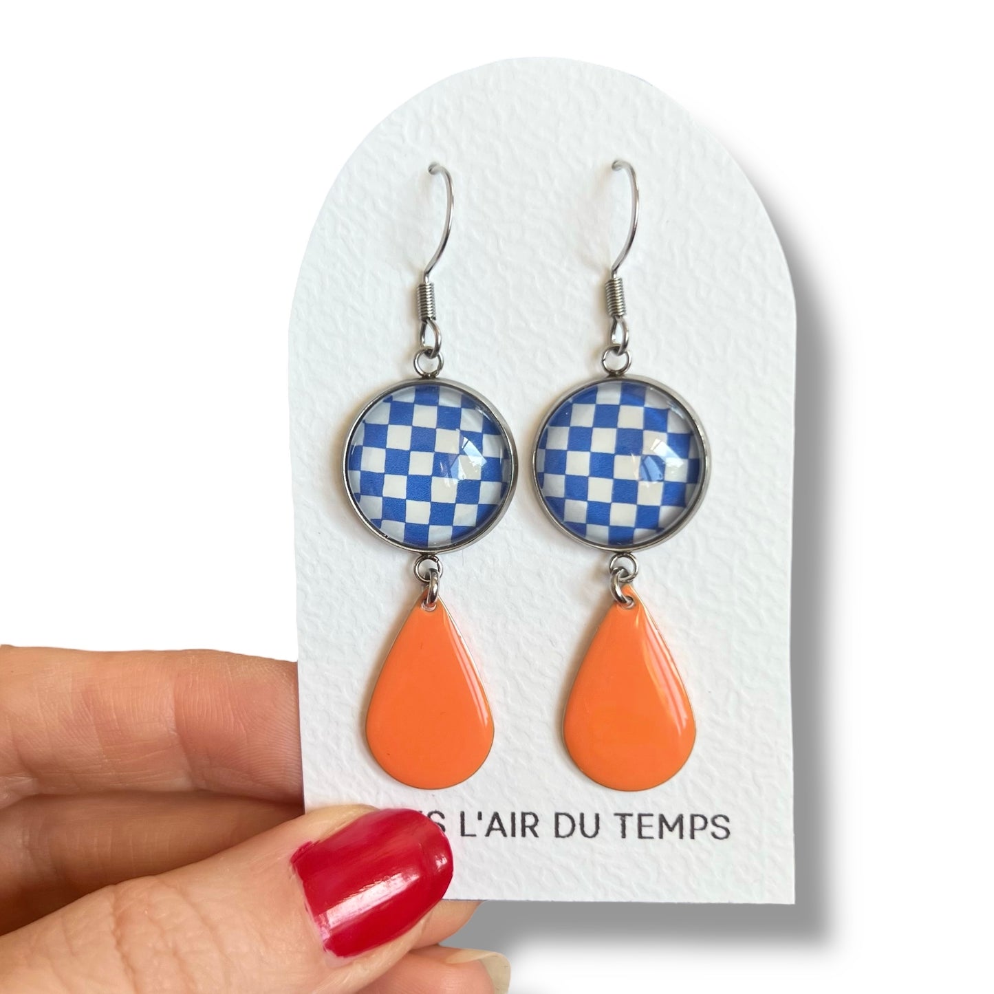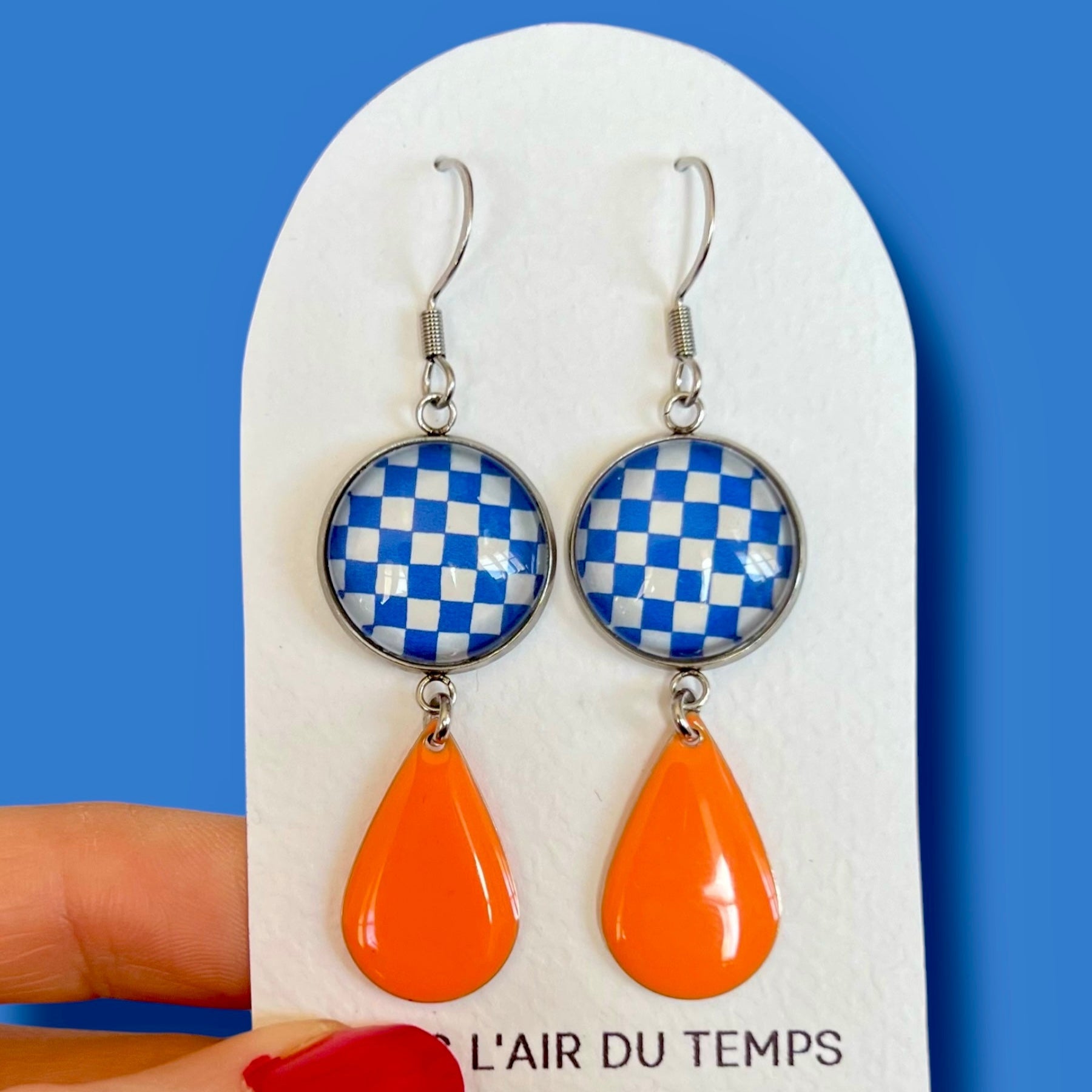 BOUCLES D'OREILLES motif damier bleu et blanc, email orange
