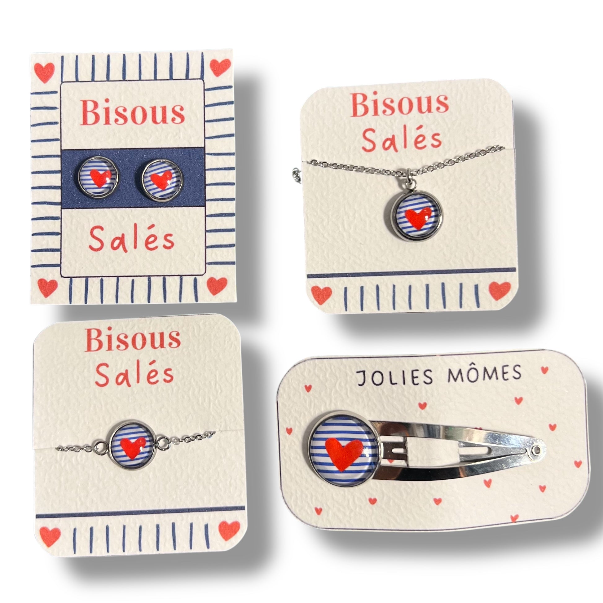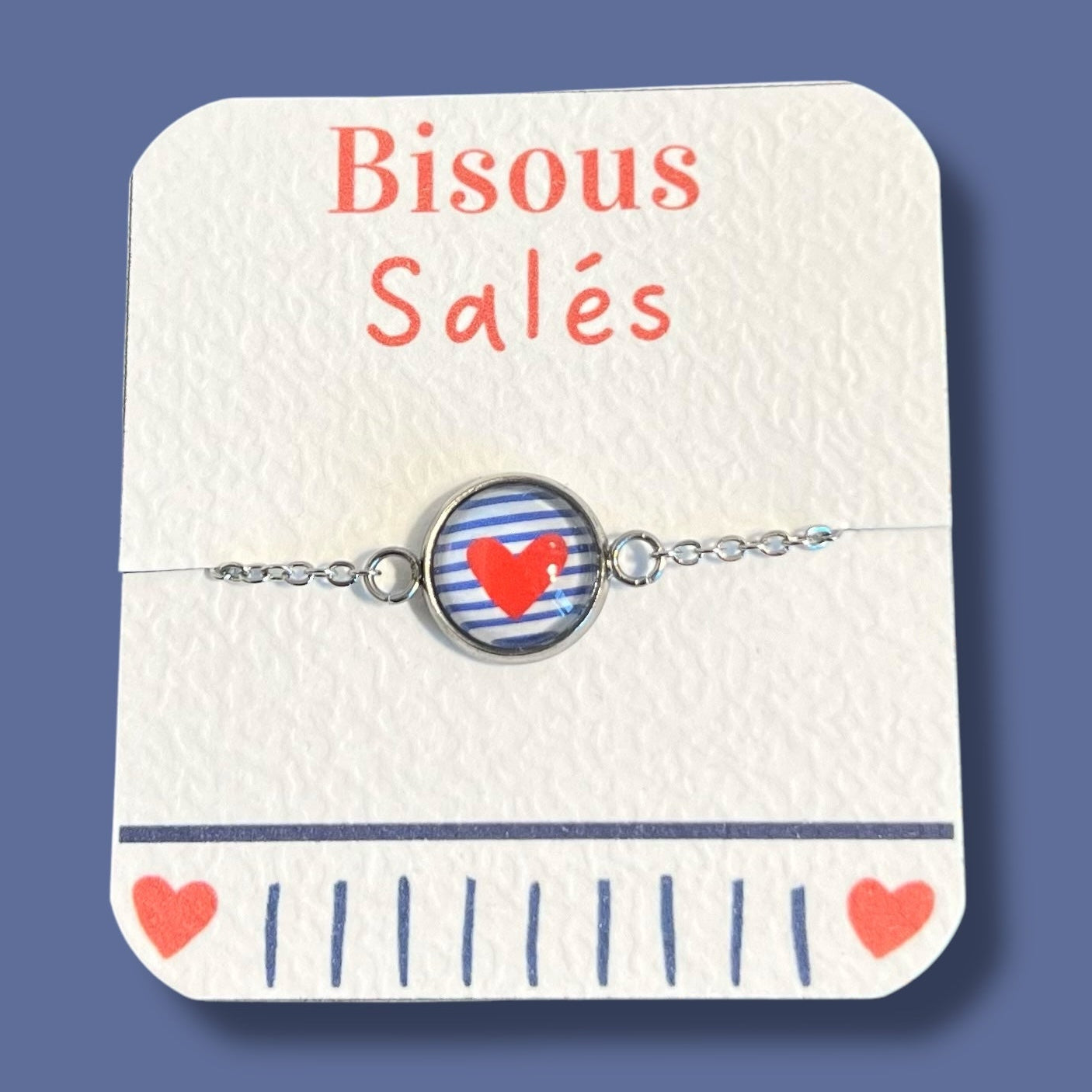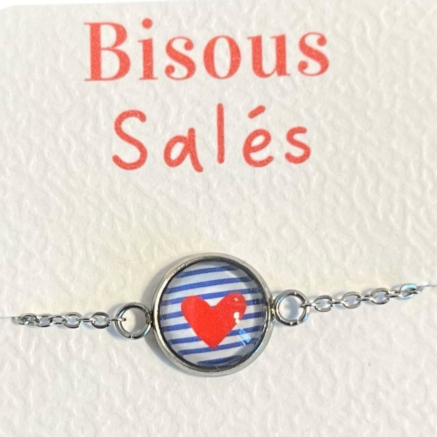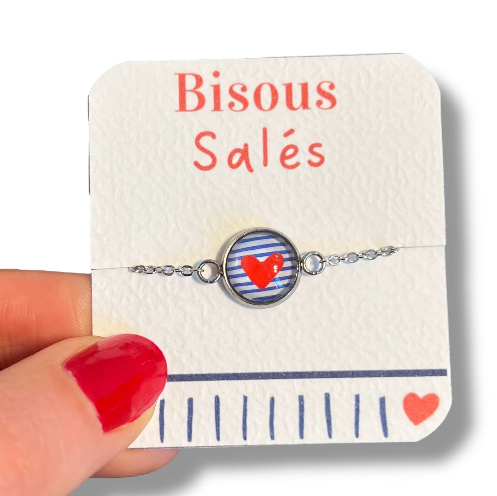 Bracelet Enfant Acier Inoxydable, Coeur Rouge et rayures bleues/ Bisous Salés!