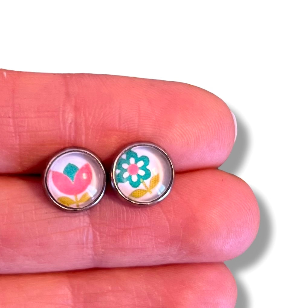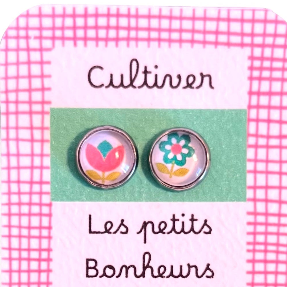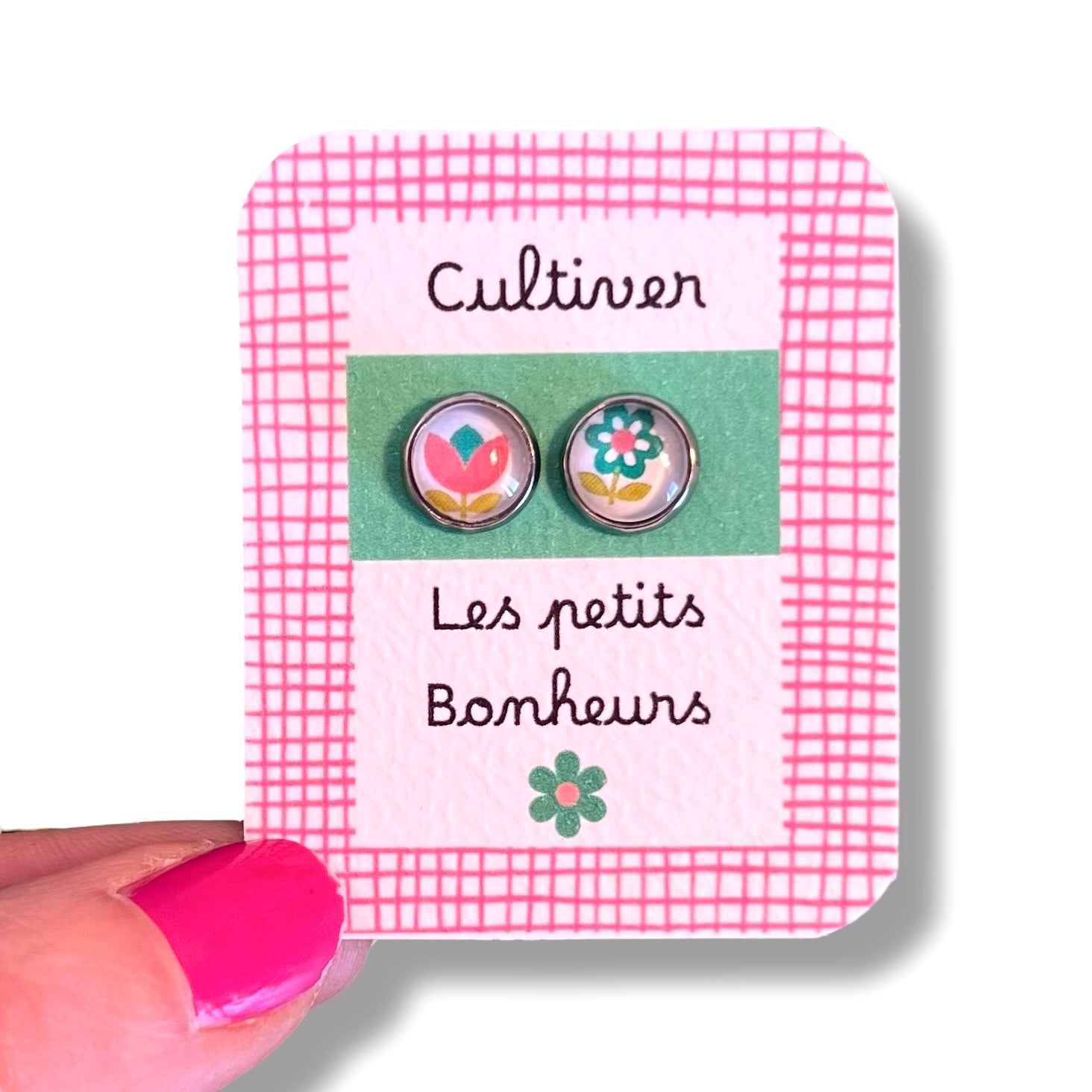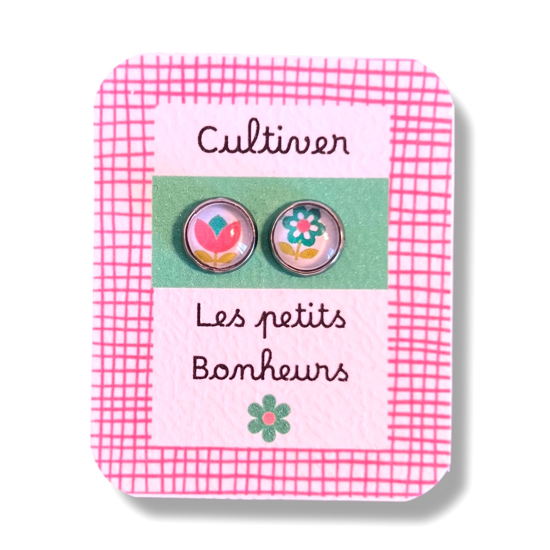 Puces d'Oreilles Enfant Fleurs Vintages Roses et vertes